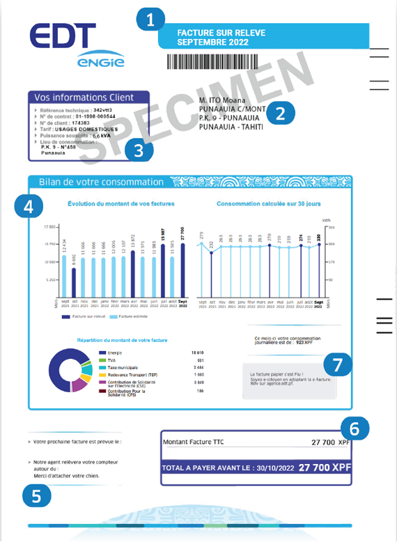 - Pour les clients de Tahiti : tous les 4 mois, vous recevez une facture calculée d'après votre consommation réelle, grâce au relevé de votre compteur.