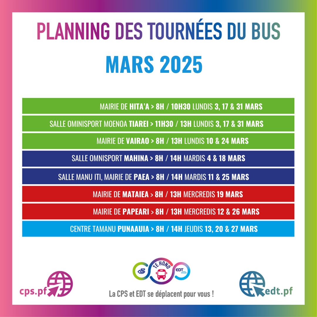 En partenariat avec la CPS, EDT propose les services d'une agence EDT et d'une agence CPS dans un bus 100% électrique, qui tourne sur plusieurs communes de Tahiti : Punaauia, Paea, Mataiea, Papeari, Vairao, Hitia’a, Tautira, Tiarei, Mahina, Arue.